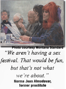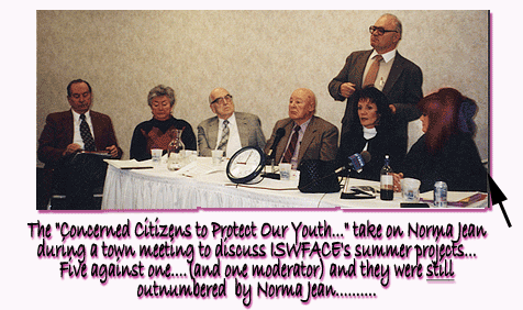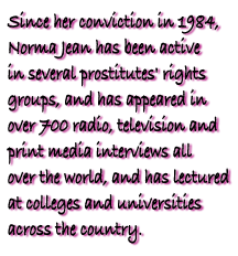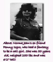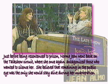 On September 17th, 1983, seven cops with their guns drawn knocked at her door to arrest her on one count of pandering. Her unfinished manuscript was confiscated by the police as "evidence" of her crime and she was taken, in handcuffs, to the downtown LA police headquarters where she once worked. The pandering charge stemmed from her attempt to fulfill the alleged sexual fantasy of a former friend who was still atraffic officer. The "friend," Penny Isgro, had come to Norma Jean's home wearing a wire, and later admitted during Norma Jean's trial that she had helped set up Norma Jean to prevent her from writing an expose of the Los Angeles Police. Through the perhaps deliberate incompetence of the then attorney (whom she later sucessfully sued) Norma Jean was given no defense whatsoever during her brief trial, and as a result, was convicted of that one count of pandering- which was a felony.