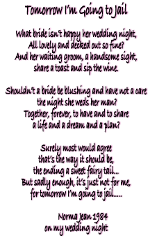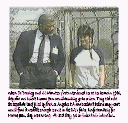 For making a phone call on behalf of her very unattractive fifty- year old, six foot two, two hundred fifty pound "friend", Norma Jean was facing a mandatory three to six year incarceration in the California State Penitentiary. The judge posponed sentencing until after a 90 day psychological evaluation could be done to determine whether or not Norma Jean poses a "threat to society" for her crime of trying to fulfill her friend's sexual fantasy. The judge allowed her two weeks to put her affairs in order, before she was to return, the day before Thanksgiving 1984, to be remanded into custody.