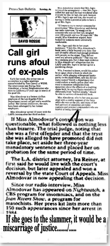 When the City stopped paying her disability benefits, she decided to take up a new career. She chose to become a high-priced Beverly Hills Call Girl. She is often asked why she chose this profession when she could do so many other things, including her crafts (doll-making)... her answer is that she wanted to make a social statement about the moral hypocrisy of our society- a society which seemed completely untroubled by the police corruption that permeated the LAPD, and yet demanded that law enforcement spend a significant portion of its scarce and valuable resources to set-up and arrest women whose sole "crime" was to accept money from men for acts of sex they could otherwise legally engage in, even with thousands of men- so long as they had sex for free. The arrest and subsequent incarceration would brand them forever as a prostitute and destroy their lives - all in the name of protecting them from exploitation.
